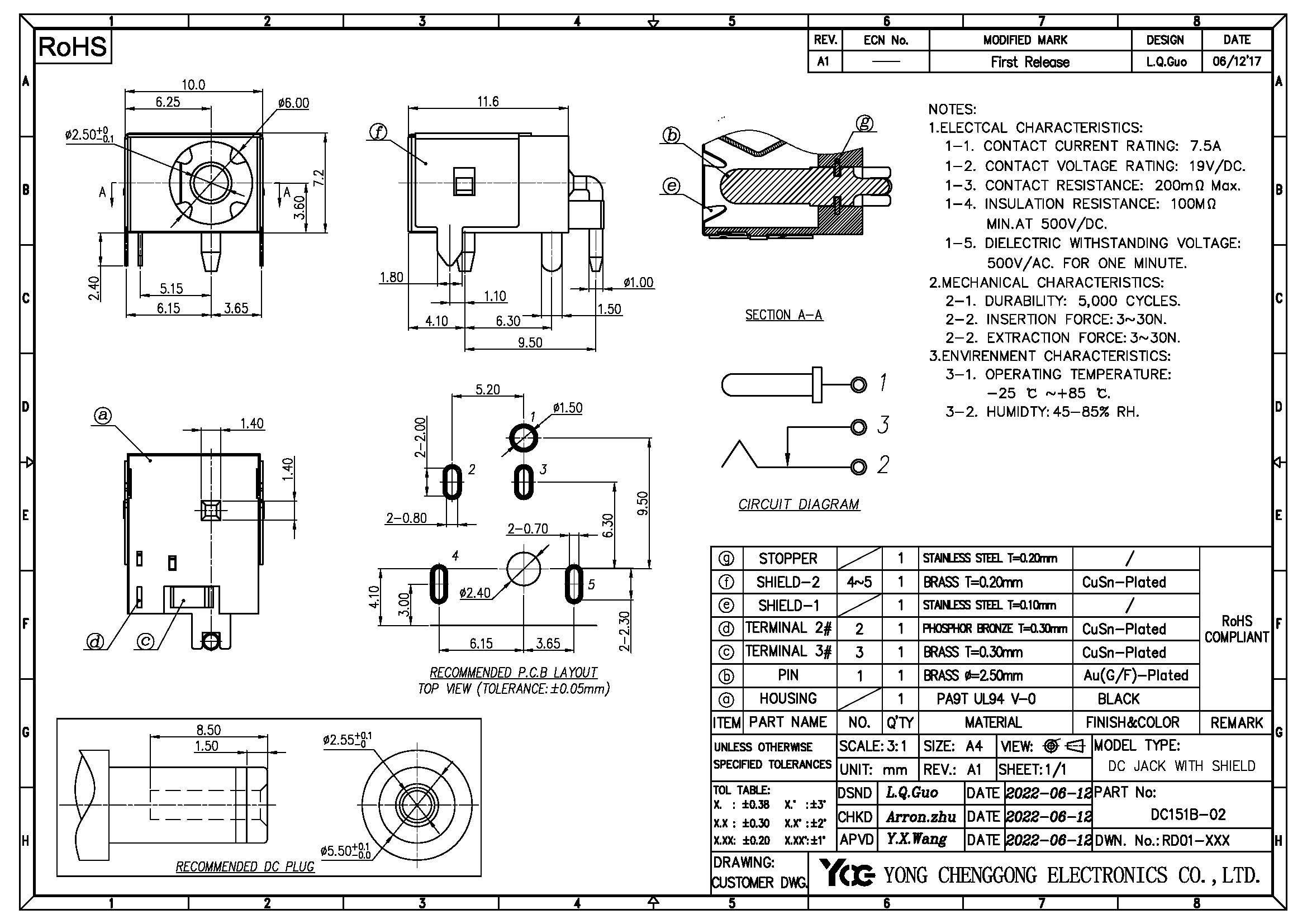 DC POWER JACK,φ2.5mm, R/A DIP WITH SHELL