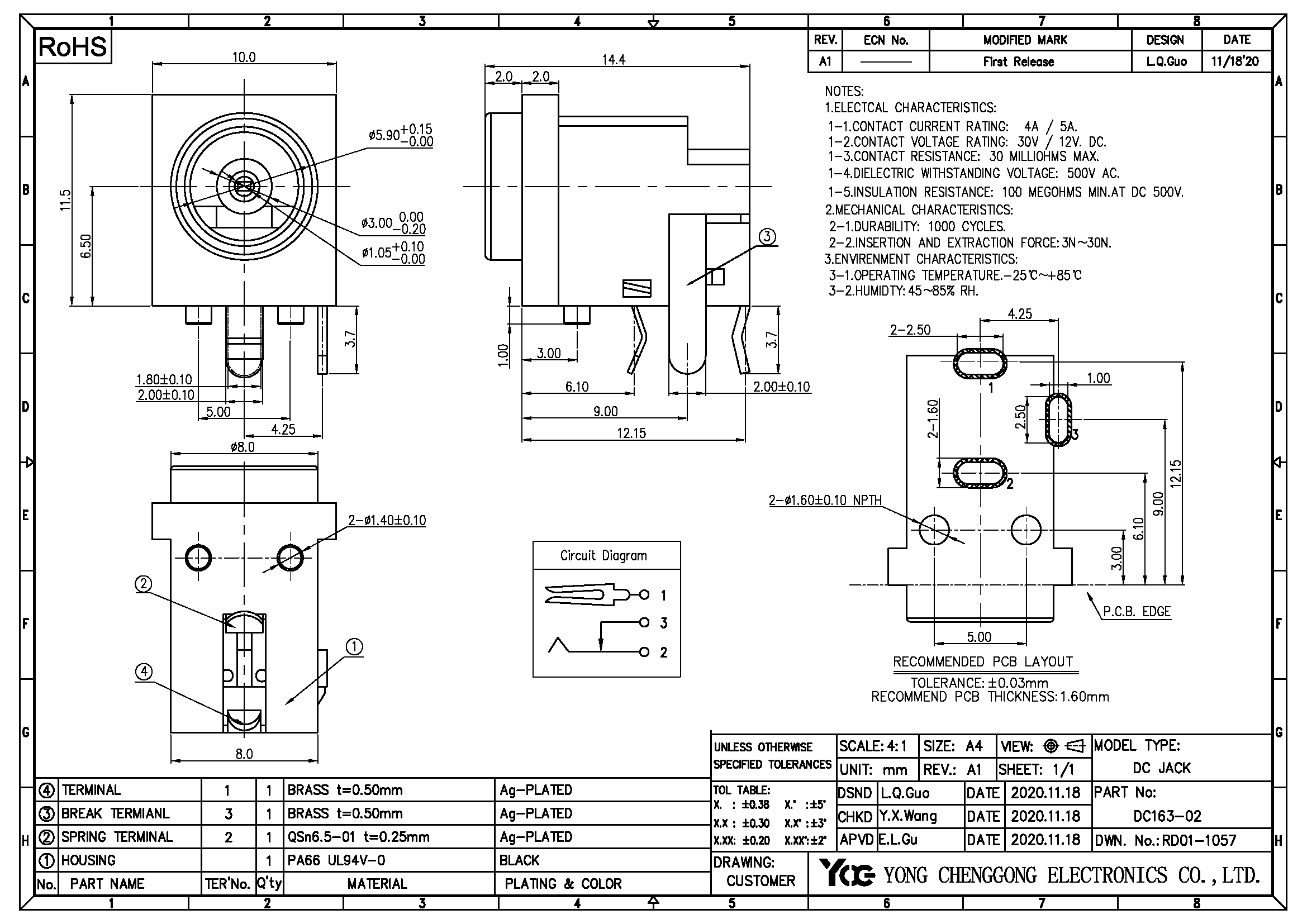 DC POWER JACK,φ1.05mm, R/A DIP