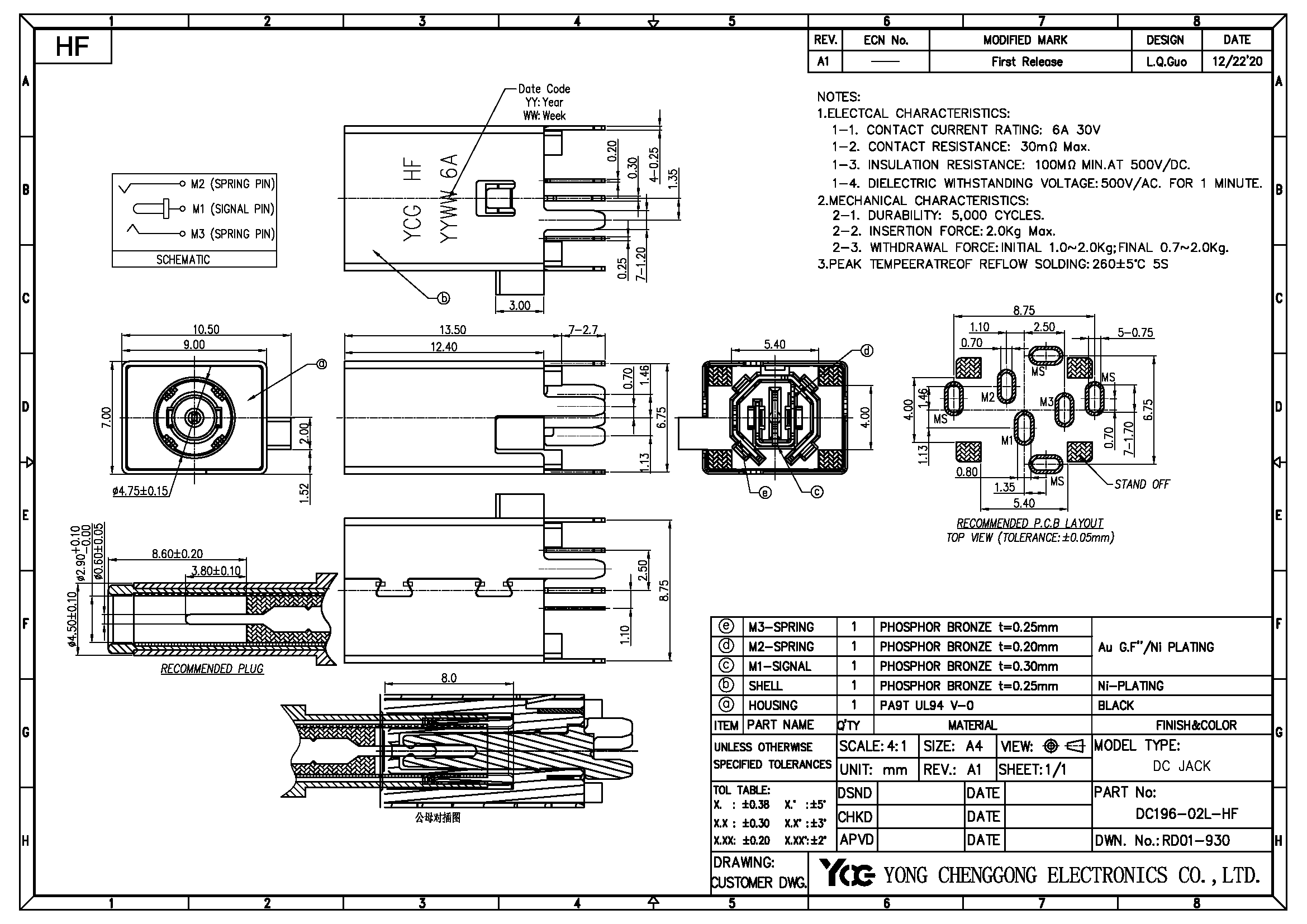 DC POWER JACK,φ0.75mm, V/T DIP WITH SHELL