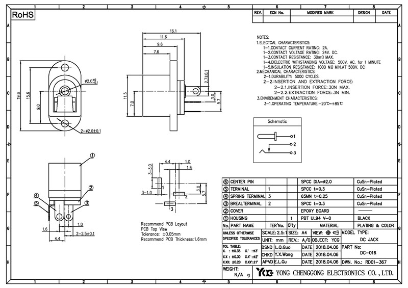 DC POWER JACK φ2.0mm, V/T DIP H11.6mm