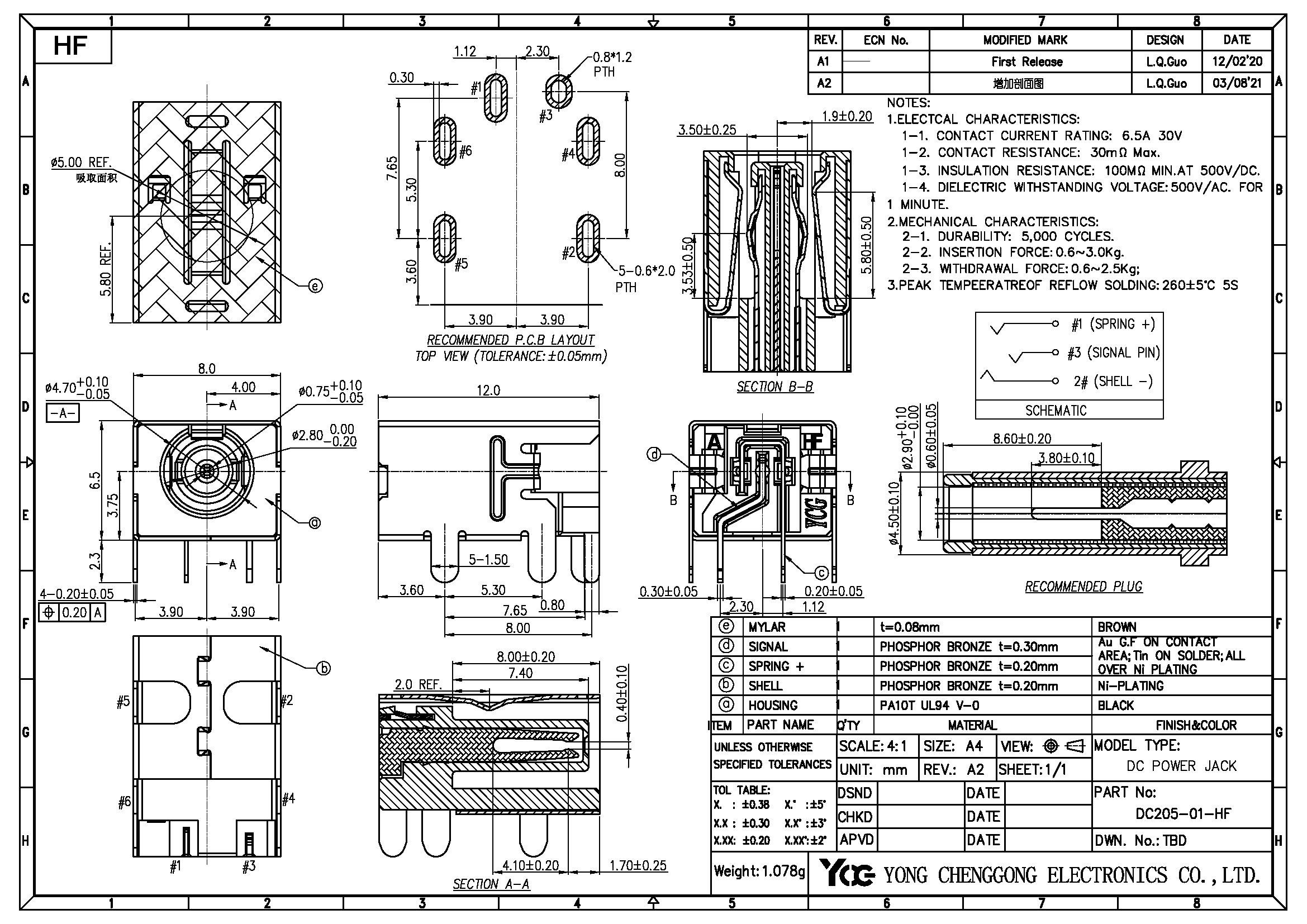 DC POWER JACK,φ0.75mm, R/A DIP WITH SHELL
