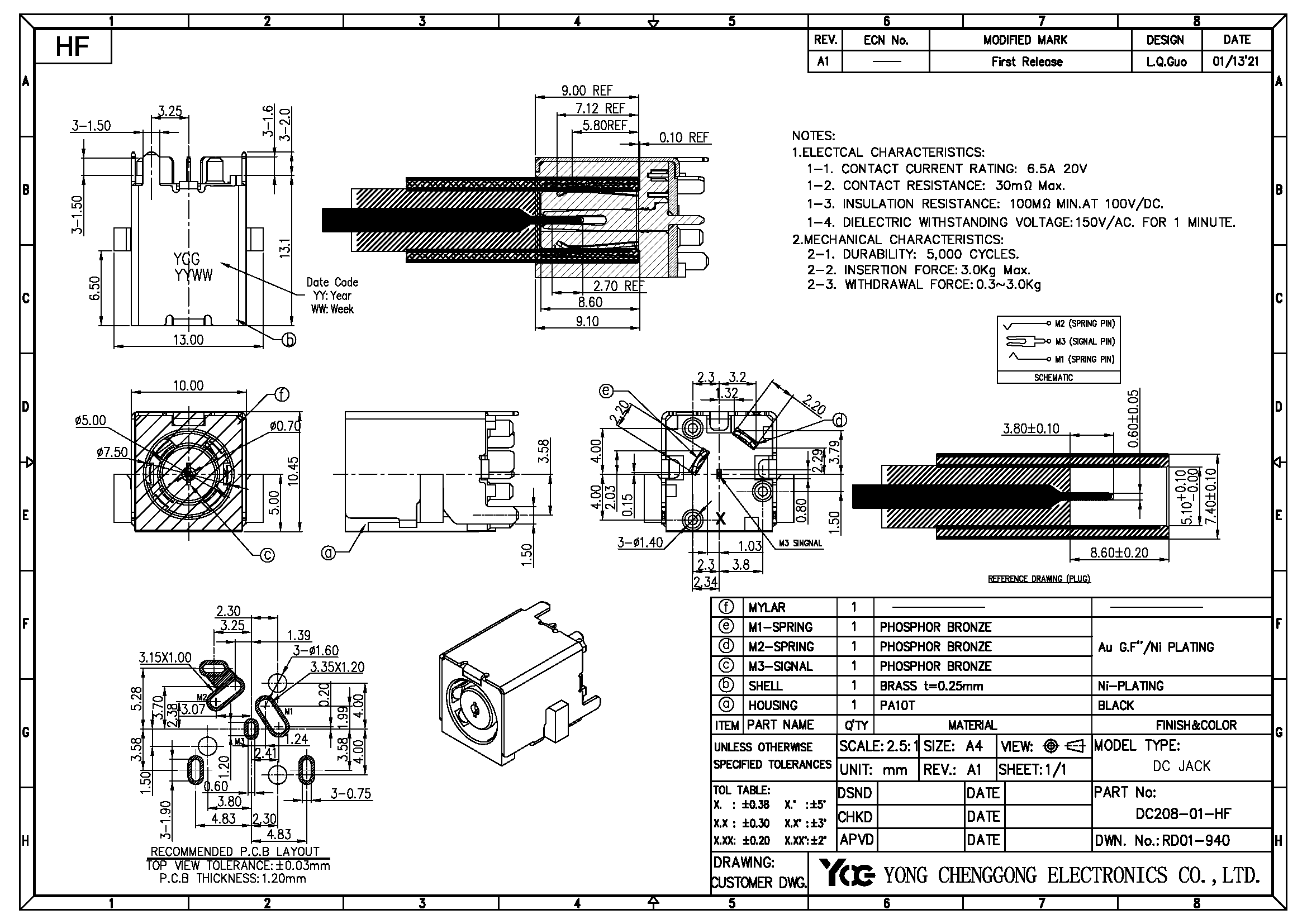 DC POWER JACK,φ0.75mm, V/T DIP WITH SHELL