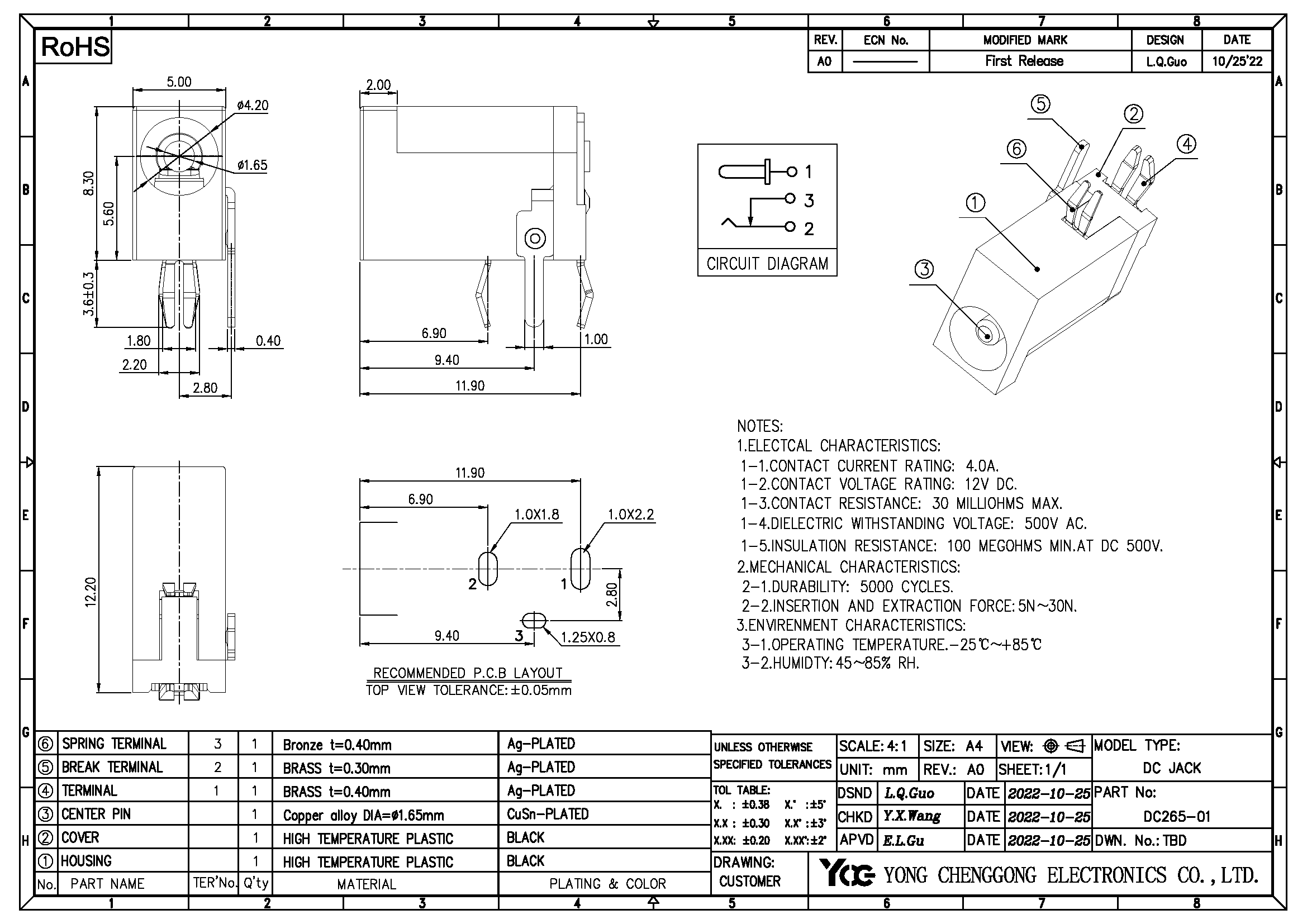 DC POWER JACK,φ1.65mm,R/A DIP