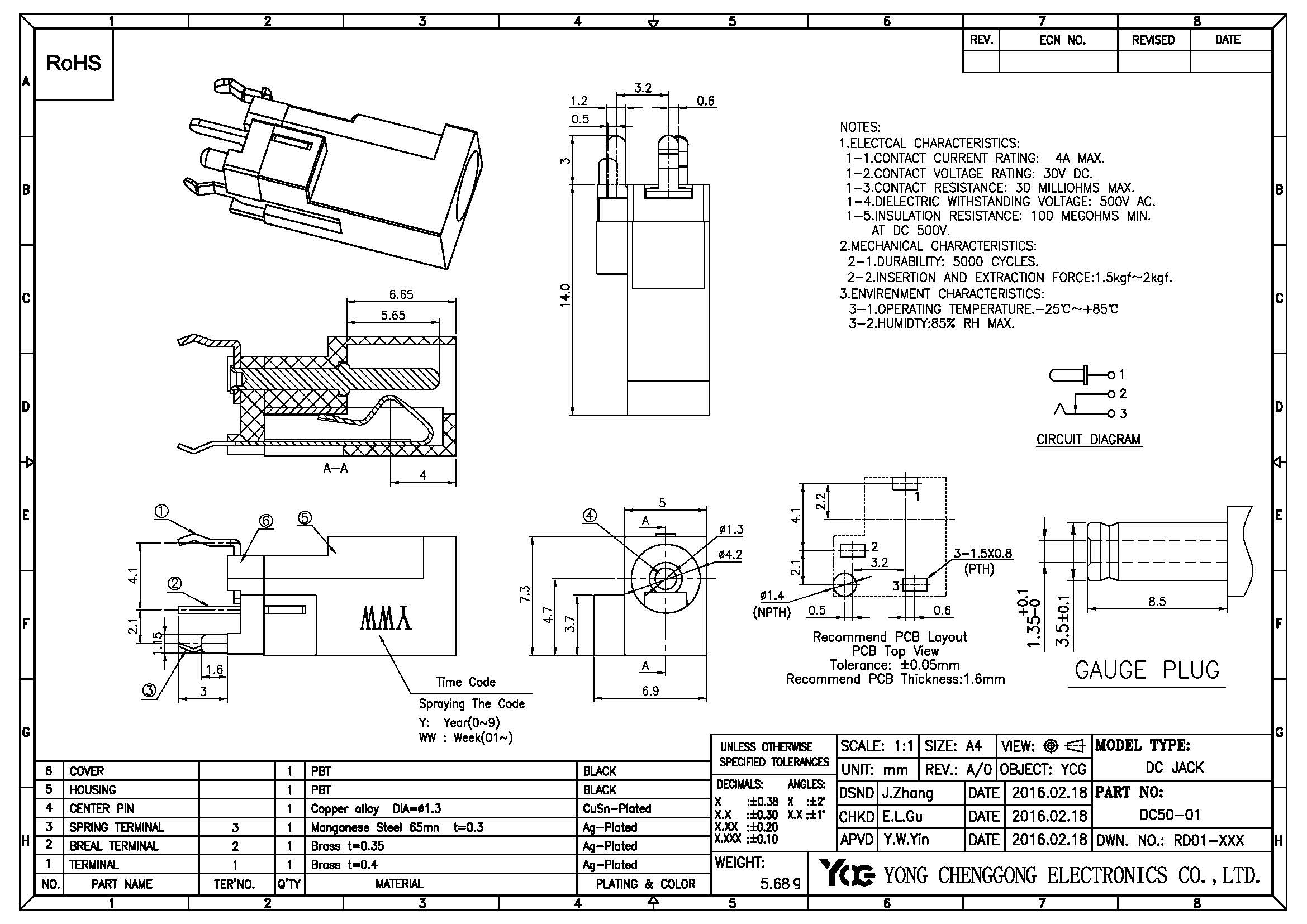 DC POWER JACK,φ1.30mm V/T DIP, H14.0mm