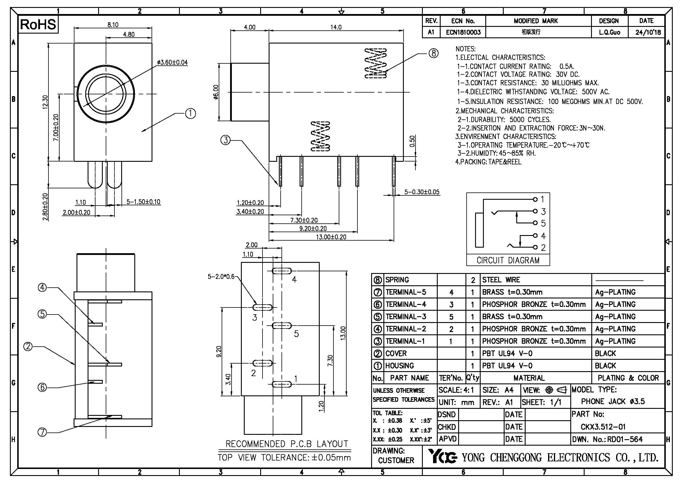 PHONE JACK φ3.6mm,R/A,CH7.0mm,DIP,BLACK&GREEN&BLUE&PINK
