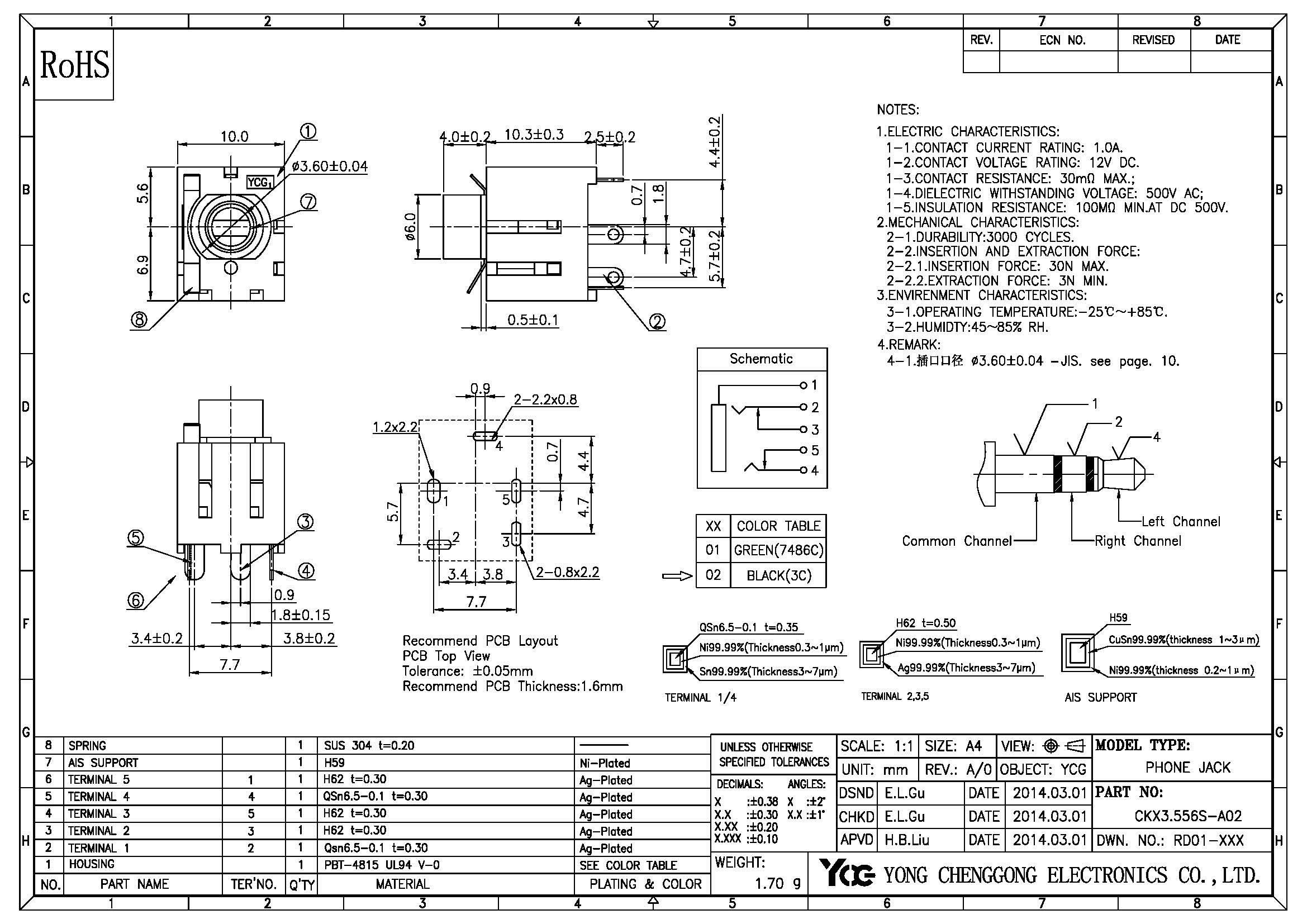 PHONE JACK φ3.6mm,V/D,H10.3mm,3 Poles,BLACK&GREEN&BLUE&PINK(OPTIONAL)