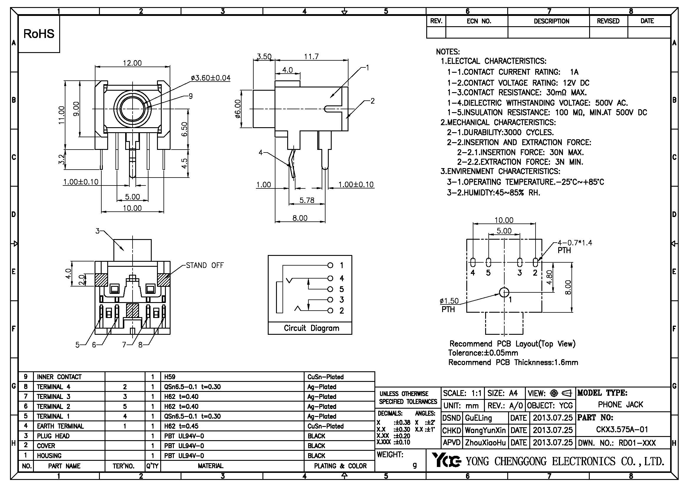 PHONE JACK φ3.6mm,R/D,CH6.50mm,3 Poles,BLACK