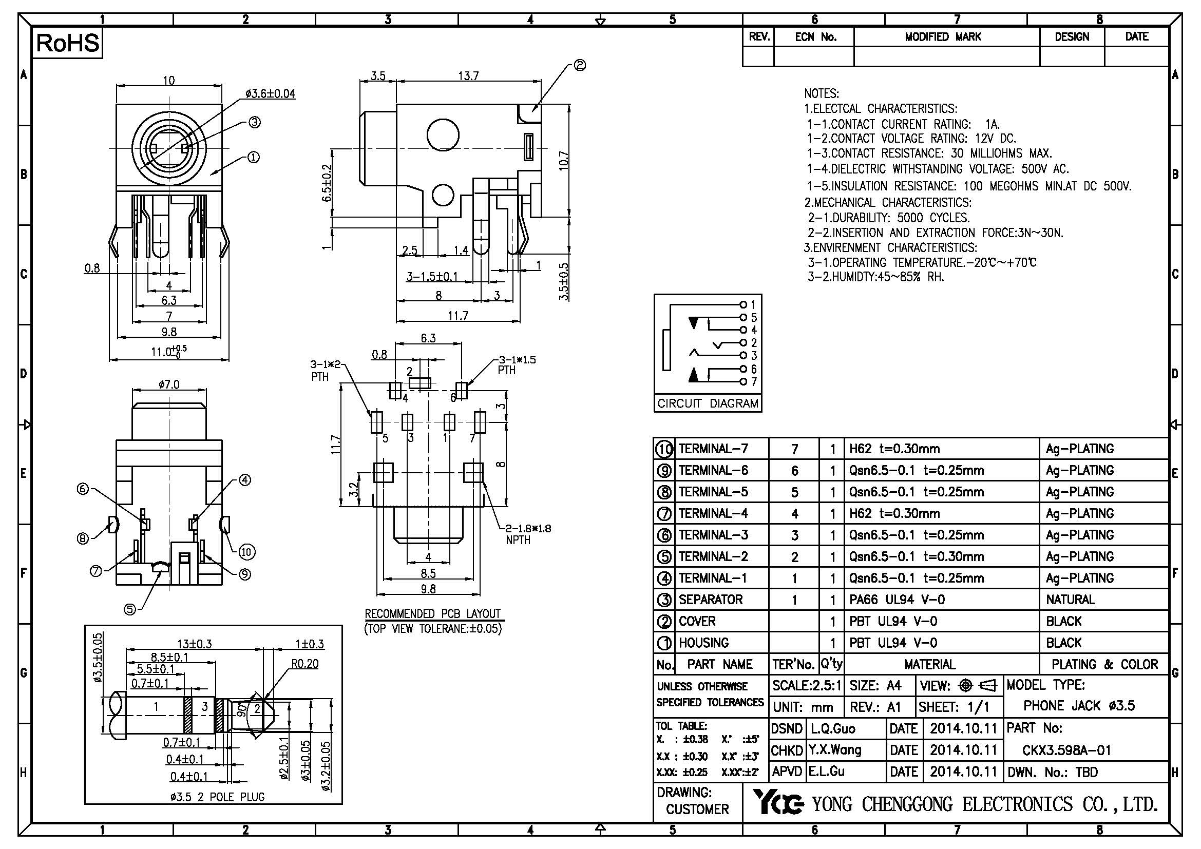 PHONE JACK φ3.6mm,R/D,CH7.5mm,3 Poles,BLACK