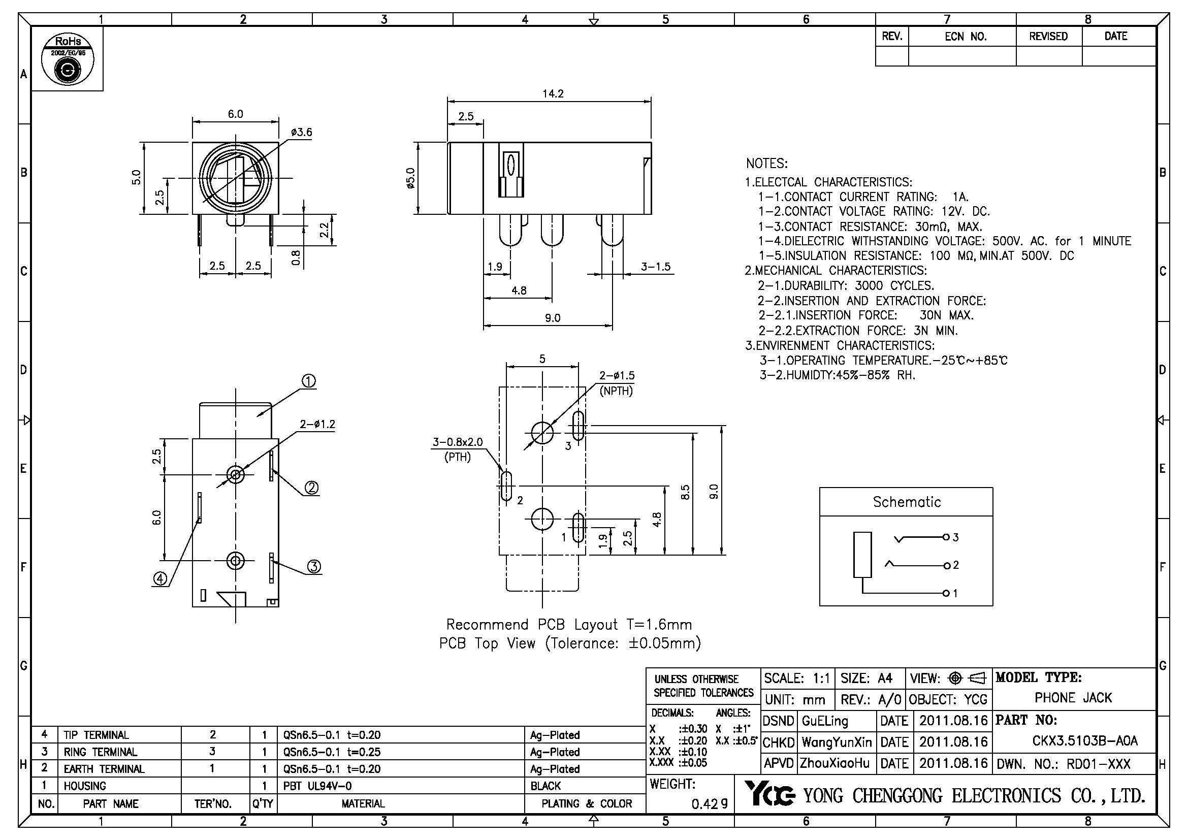 PHONE JACK φ3.6mm,R/D,CH2.5mm,3 Poles,BLACK