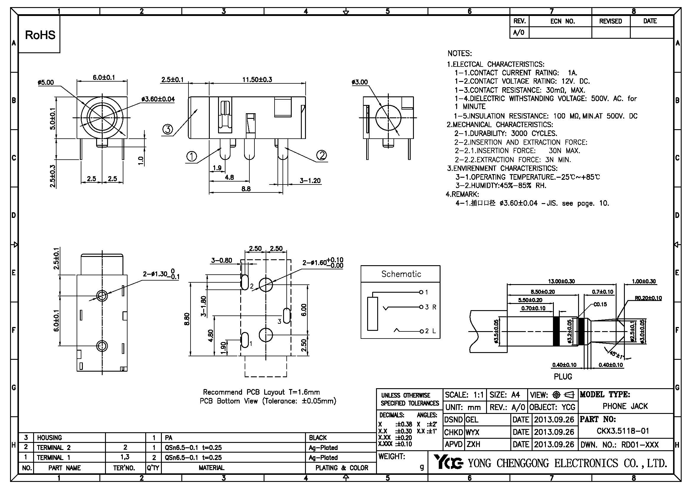 PHONE JACK φ3.6mm,R/D,CH.2.5mm,3 Poles,BLACK