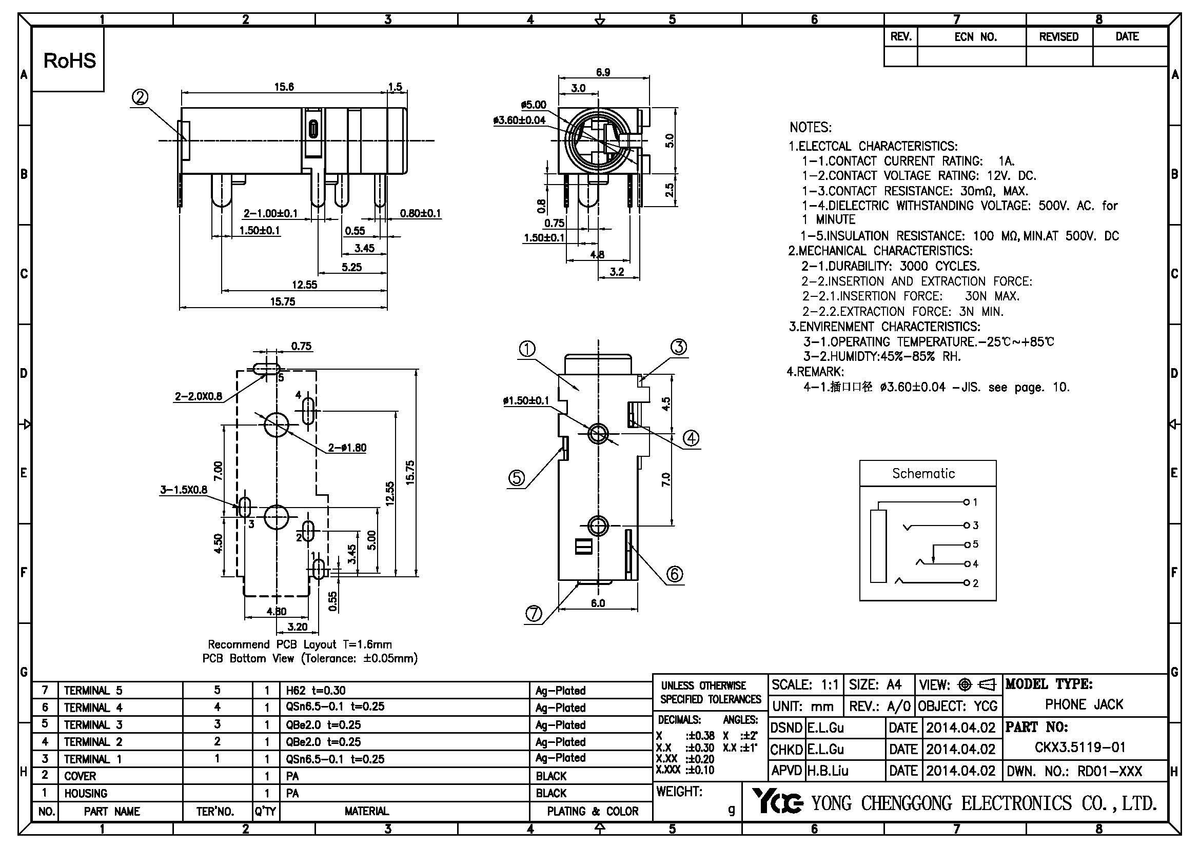 PHONE JACK φ3.6mm,R/D,CH.2.5mm,4 Poles,BLACK