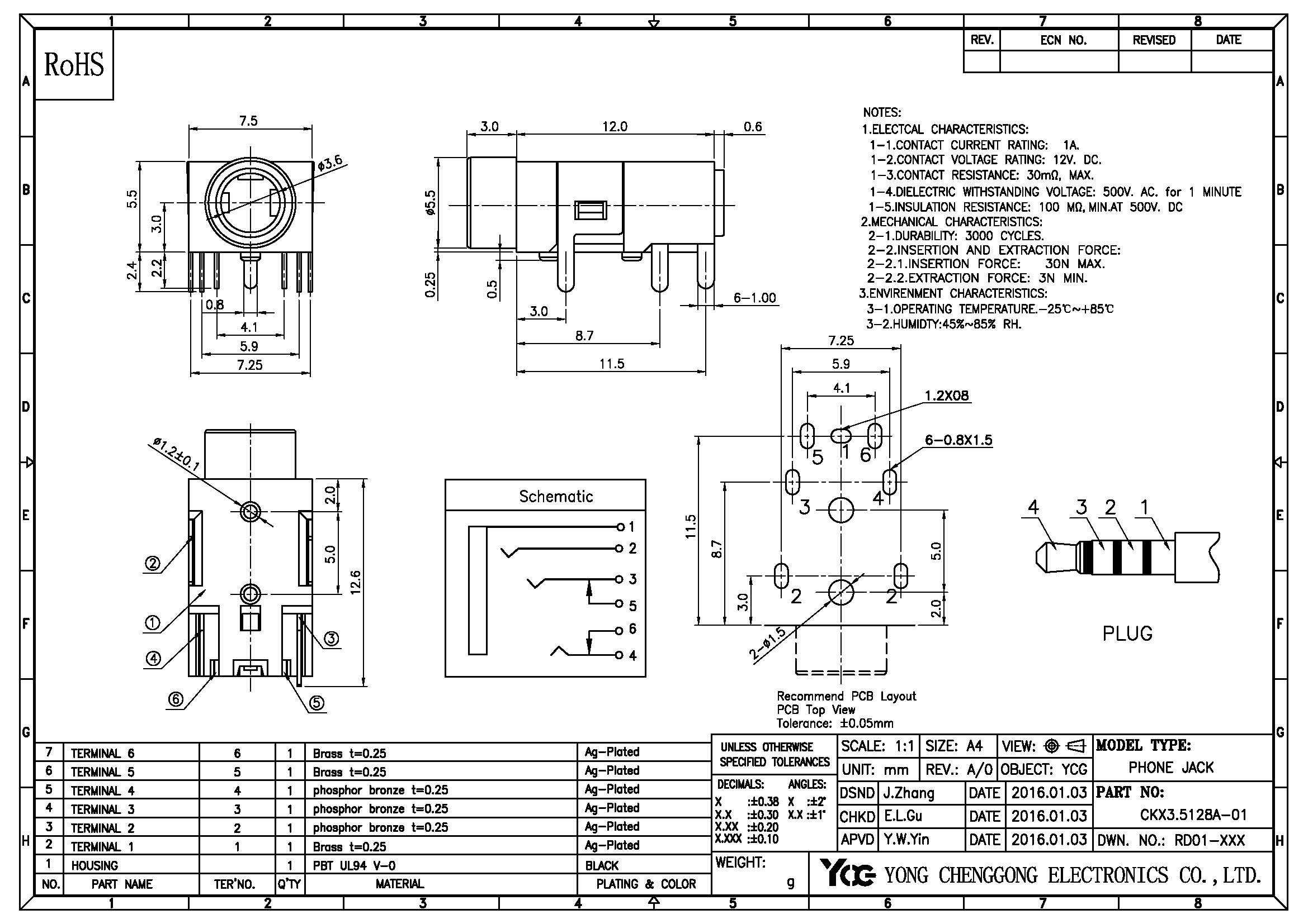 PHONE JACK φ3.6mm,R/D,CH3.0mm,3 Poles,BLACK&YELLOW