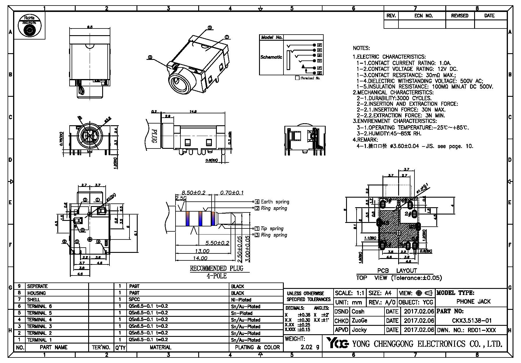 PHONE JACK φ3.6mm,R/A DIP,CH3.3mm,4 Poles,BLACK