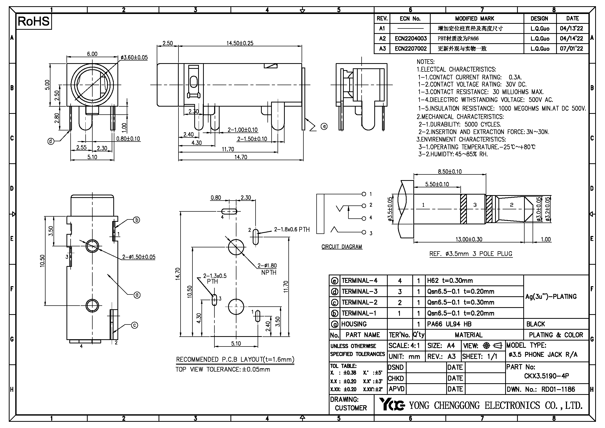 PHONE JACK φ3.6mm,R/S,3 Poles,BLACK