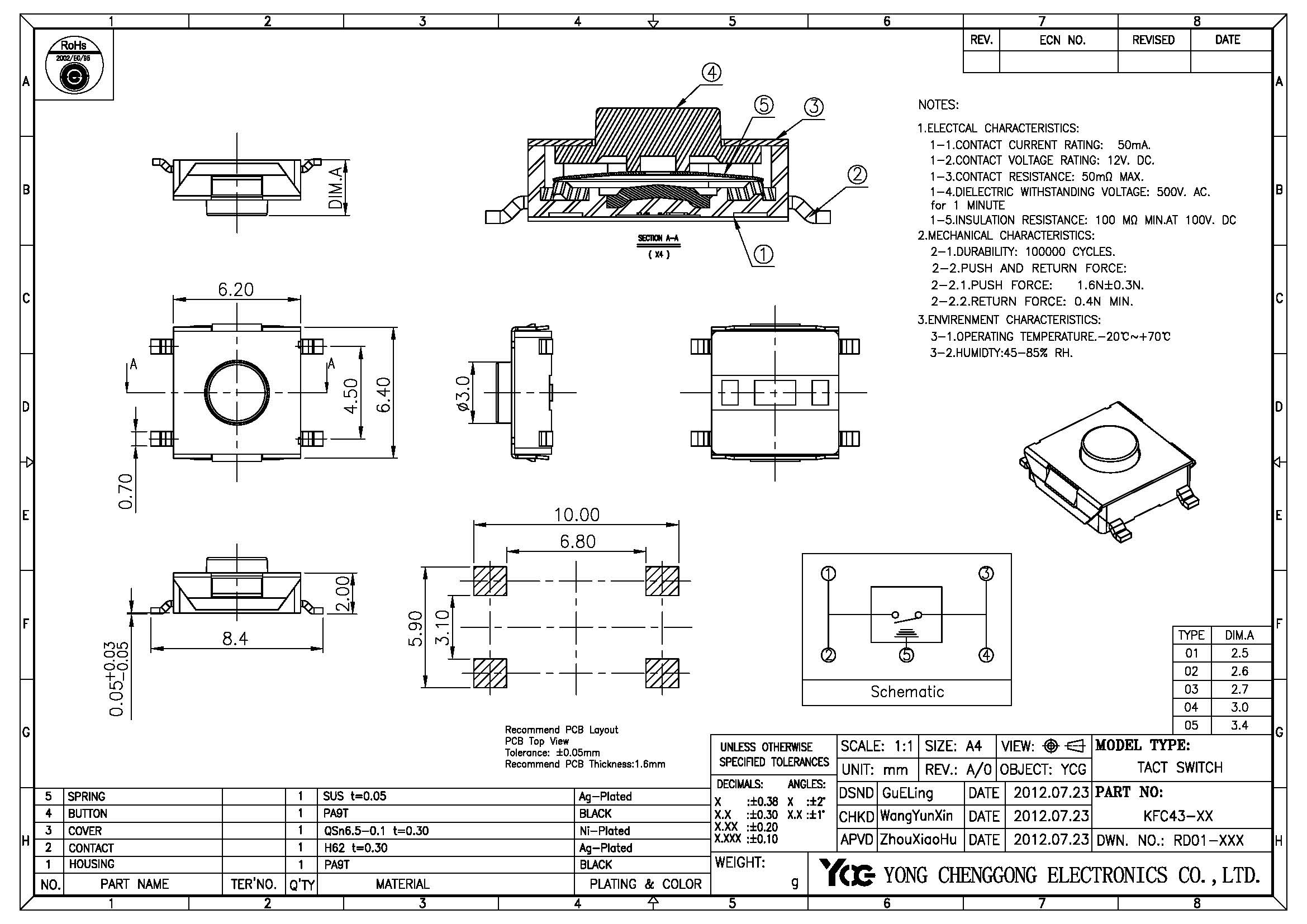 TACT SWITCH V/S,L6.4*W6.4*H2.5,160gf/260gf±50gf,Black