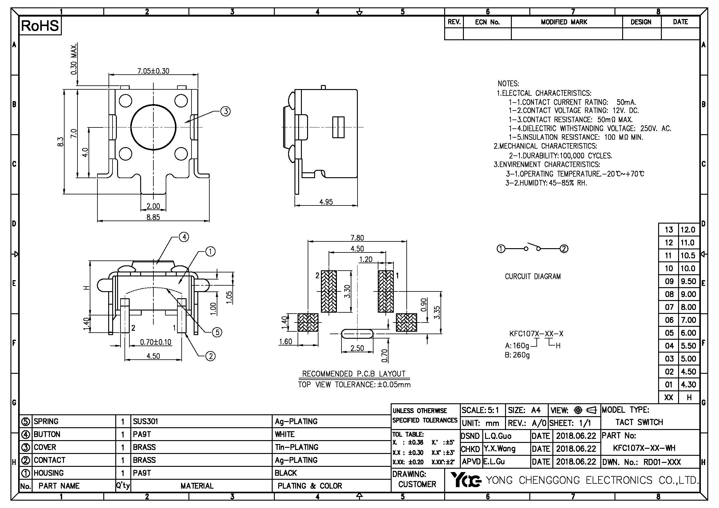 TACT SWITCH R/S,CH=4.0mm,250gf±50gf